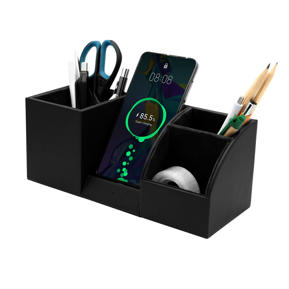 Настольный органайзер Boss c беспроводной зарядкой и световым индикатором. Для работы или дома, сочетающий в себе подставку для канцелярских принадлежностей и мелких аксессуаров. Вход: 9V/1.67A/5V/2A USB 2.0. Выход: Беспроводная зарядка 10W. В комплекте кабель USB и инструкция. Область зарядки смартфона поддерживает все Android/Ios устройства с функцией беспроводной зарядки. Для работы беспроводной зарядки необходимо подключать устройство к сети через адаптер.