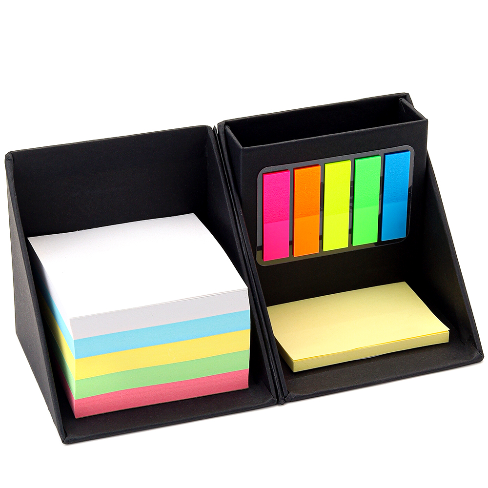Настольный органайзер Nivora с бумажными стикерами — компактное и стильное решение для хранения канцелярии и быстрых заметок. Помогает держать рабочее место в порядке и вдохновляет на продуктивность. 9,3*9,3 см - размер в сложенном виде, 19,3*9,3*9,3 см - размер в разложенном виде; В состав органайзера входят: - подставка картонная для канцелярии черного цвета, - бумажный блок для записей: 5х100 листов, - бумажный блок для записей с клеевым краем: 50 листов, - малые стикеры с клеевым краем пяти цветов: 5х20 листов.