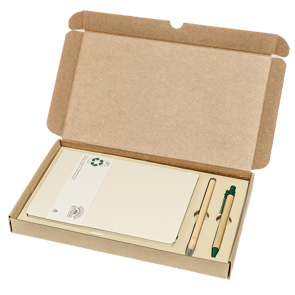 Подарочный набор в стильной картонной коробке бежевого цвета. Внутри на аккуратном ложементе располагаются ежедневник недатированный в твердом переплете и картонная ручка с колпачком. Состав набора: Блокнот из переработанных тетрапак в твёрдом переплёте Rebirth, серый (арт. 51013.02) - 1 шт. Вечный карандаш из бамбука Genero, бамбуковый (арт. 1077.19) - 1 шт. Шариковая ручка Natural Bio, зеленый (арт. 1020.04) - 1 шт Самосборная коробка из бурого микрогофрокартона (арт. RUS5055.19) - 1 шт.