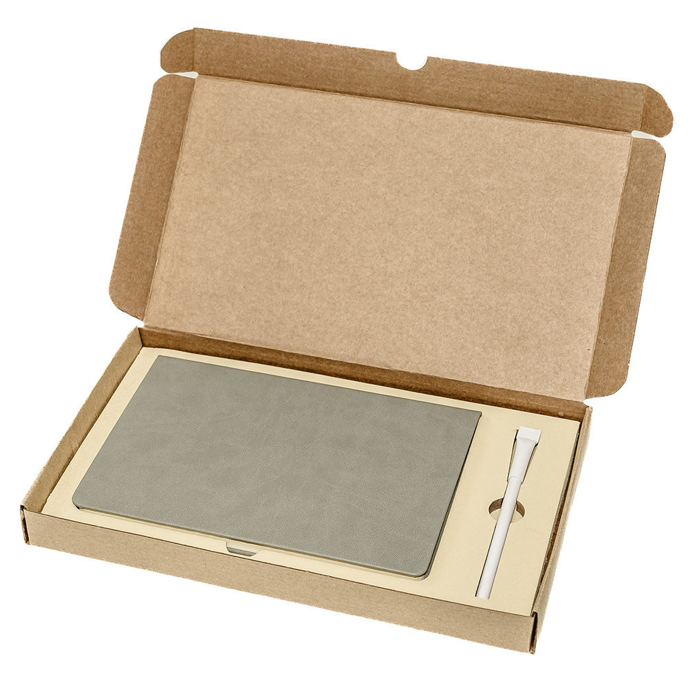 Подарочный набор в стильной картонной коробке бежевого цвета. Внутри на аккуратном ложементе располагаются ежедневник недатированный в твердом переплете и картонная ручка с колпачком. Состав набора: Ежедневник A5 недатированный Dear в твёрдом переплёте, серый (арт. 51021.10) - 1 шт. Ручка картонная Greta с колпачком, белый (арт. 1041.01) - 1 шт. Самосборная коробка из бурого микрогофрокартона (арт. RUS5055.19) - 1 шт.