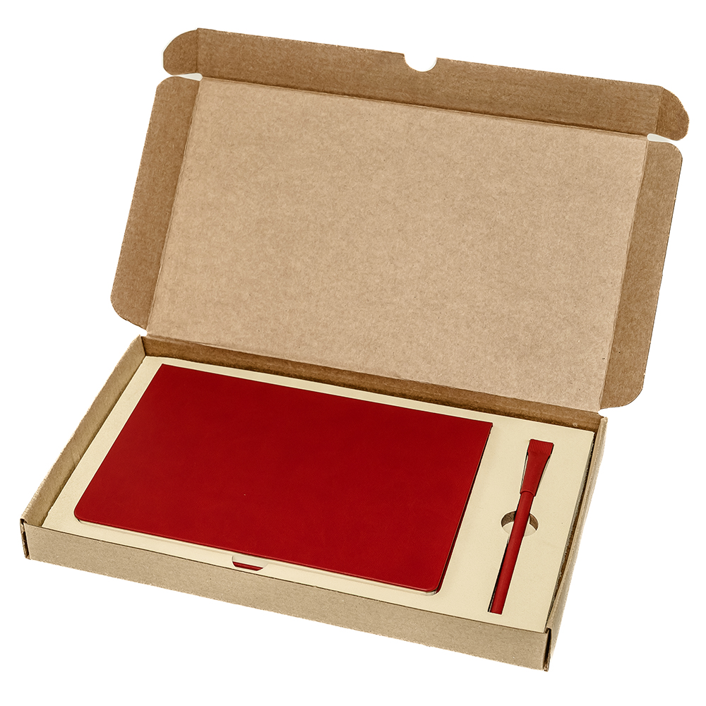 Подарочный набор в стильной картонной коробке бежевого цвета. Внутри на аккуратном ложементе располагаются ежедневник недатированный в твердом переплете и картонная ручка с колпачком. Состав набора: Ежедневник A5 недатированный Dear в твёрдом переплёте, красный (арт. 51021.05) - 1 шт. Ручка картонная Greta с колпачком, красный (арт. 1041.05) - 1 шт. Самосборная коробка из бурого микрогофрокартона (арт. RUS5055.19) - 1 шт.