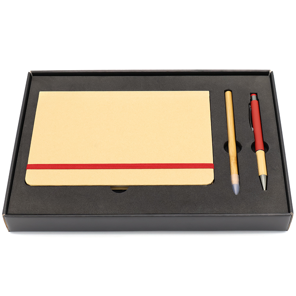 Подарочный набор в стильной цветной картонной коробке черного цвета (крышкой-дно). Внутри на аккуратном ложементе располагаются блокнот, ручка c корпусом из бамбука, и вечный карандаш. Состав набора: Блокнот Элвин в твёрдом переплёте, красный (арт. 51004.05) - 1 шт. Ручка металлическая Сайрис софт-тач, красный (арт. 1045.05) - 1 шт. Вечный карандаш из бамбука Genero, бамбуковый (арт. 1077.19) - 1 шт.