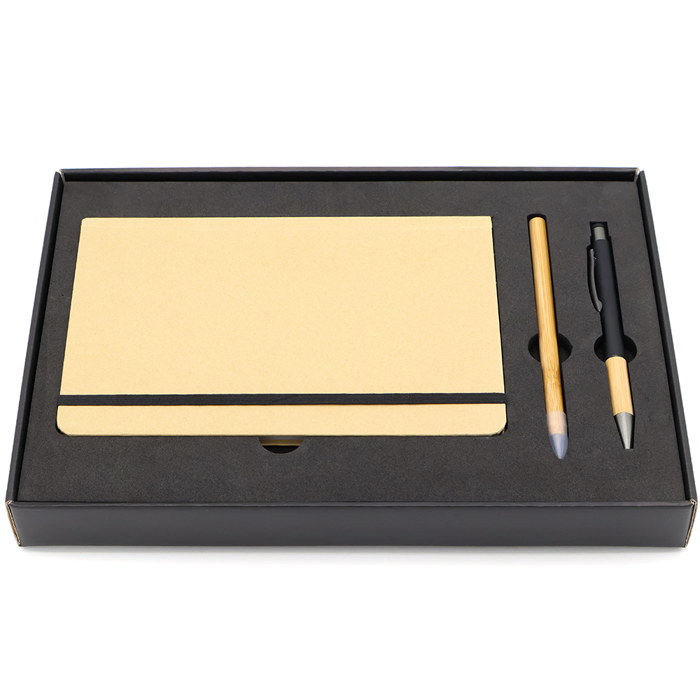Подарочный набор в стильной цветной картонной коробке черного цвета (крышкой-дно). Внутри на аккуратном ложементе располагаются блокнот, ручка c корпусом из бамбука, и вечный карандаш. Состав набора: Блокнот Элвин в твёрдом переплёте, черный (арт. 51004.02) - 1 шт. Ручка металлическая Сайрис софт-тач, черный (арт. 1045.02) - 1 шт. Вечный карандаш из бамбука Genero, бамбуковый (арт. 1077.19) - 1 шт.