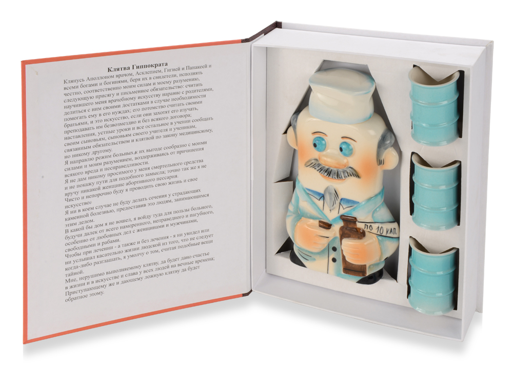 Настольная книга врача — это изящный и оригинальный фарфоровый набор, выполненный в виде книги. В комплект входят штоф и рюмочки, украшенные тематическими изображениями и деталями, связанными с медициной и врачебной практикой. Такой набор станет стильным украшением стола и отличным подарком для медицинских работников, студентов или любителей медицины. Штоф удобно использовать для хранения напитков, а рюмочки — для подачи любимых напитков в торжественной обстановке. Этот набор в виде книги подчеркнет профессиональную тематику и создаст особую атмосферу уюта и уважения к профессии врача.