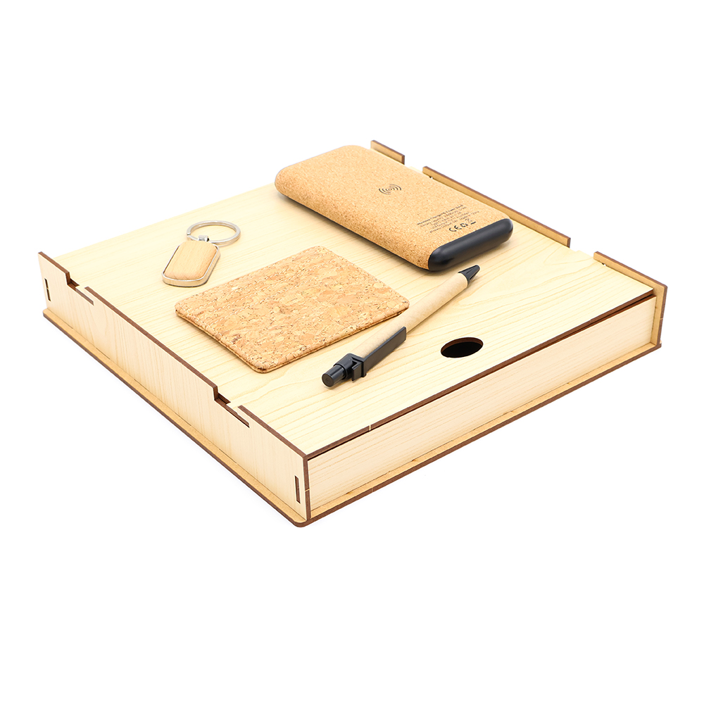 Подарочный набор в эко стиле. Полезный, необычный и красивый презент, который точно пригодится, а так же порадует своим видом! Упаковка из древесноволокнистной плиты высокой плотности (ХДФ/HDF) обеспечивает удобство погрузки и разгрузки, сохранность в пути. Состав набора: Подарочная коробка ламинированная из HDF 25,5*25,5*4,5 см - 1 шт. (Артикул: 53300) Внешний аккумулятор Suntory с беспроводной зарядкой, 10000 mAh - 1 шт. (Артикул: 2029.02) Брелок Woody G(овал) - 1 шт. (Артикул: 12025Х.19) Держатель банковских карт Set - 1 шт. (Артикул: 37008.00) Шариковая ручка Natural Bio - 1 шт. (Артикул: 1020.02) Ложемент 24,1х24,1х2 см (внеший аккум. + брелок + держатель для карт + ручка) 1 шт. (Артикул: 53060.1)