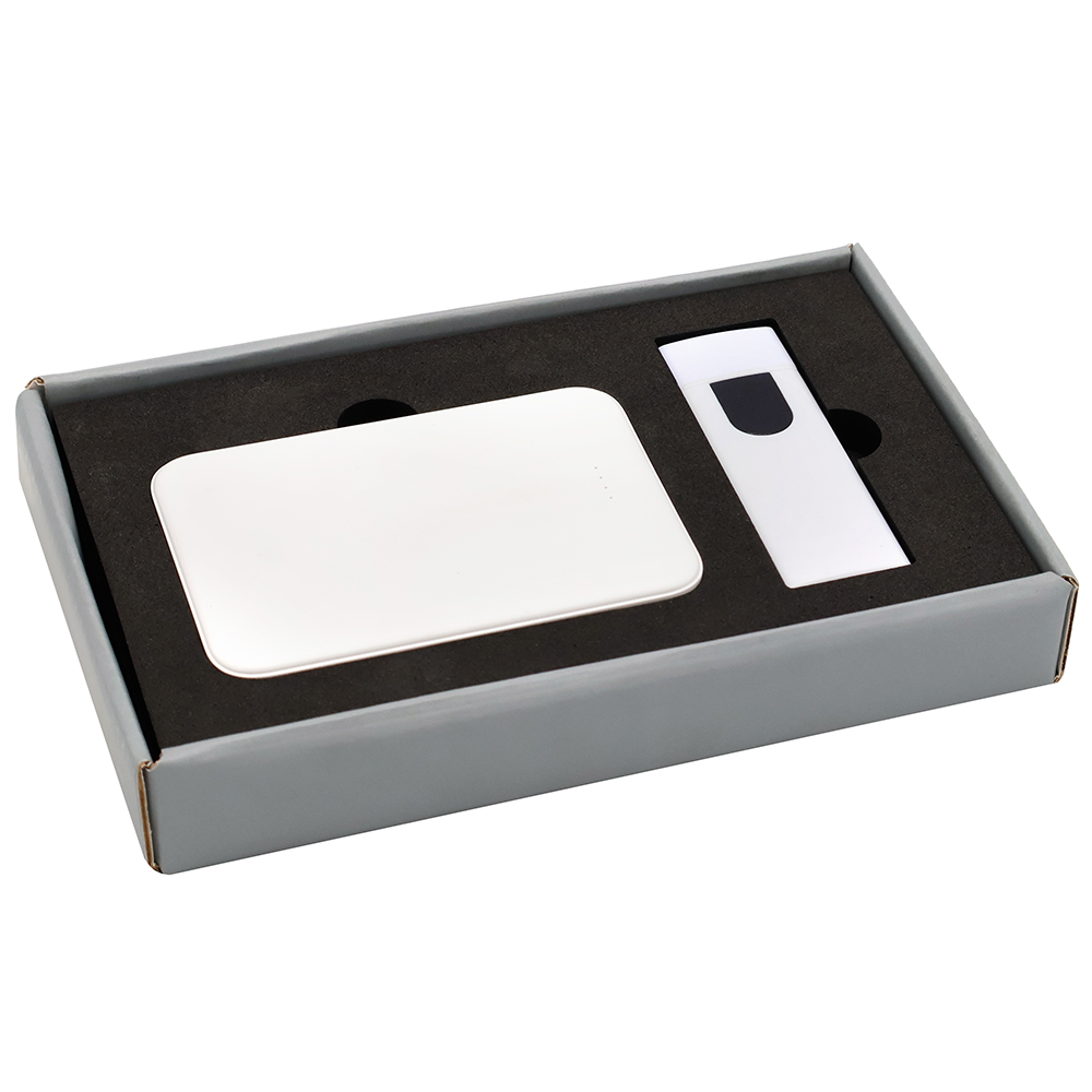 Подарочный набор в стильной цветной картонной коробке серого цвета (крышкой-дно). Внутри на аккуратном ложементе расположены внешний аккумулятор емкостью 5000 mAh и электронная зажигалка. Компактный и мощный внешний аккумулятор обеспечивает надежное подзаряжание мобильных устройств в любое время, а современная электронная зажигалка сочетает в себе удобство и безопасное использование без огня. Этот набор станет практичным и элегантным подарком для людей, ценящих функциональность и стиль. Состав набора: Внешний аккумулятор Fluffy, белый (артикул 2041.01) - 1 шт. Зажигалка-накопитель USB Abigail, белый (артикул 18007.01) - 1 шт. Коробка Protect матовой поверхностью, серый (артикул RUS5051.19) - 1 шт.