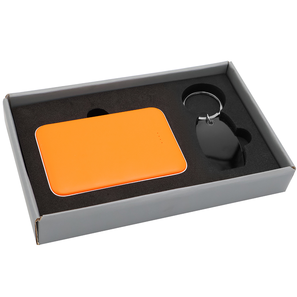 Подарочный набор в элегантной цветной картонной коробке серого цвета с конструкцией крышка-дно. Внутри расположены аккуратно закрепленные на ложементе внешний аккумулятор емкостью 5000 mAh и металлический карманный брелок. Внешний аккумулятор обладает компактным дизайном и обеспечивает надежный запас энергии для мобильных устройств в пути, а стильный металлический брелок станет практичным и эстетичным аксессуаром для ключей. Этот набор идеально подходит в качестве презента для тех, кто ценит удобство, качество и современный стиль. Состав набора: 1. Внешний аккумулятор Fluffy, оранжевый (артикул 2041.07) - 1 шт. 2. Брелок Nobel металлический, чёрный (артикул 12011.02) - 1 шт. 3. Коробка Protect матовой поверхностью, серый (артикул RUS5051.19) - 1 шт.