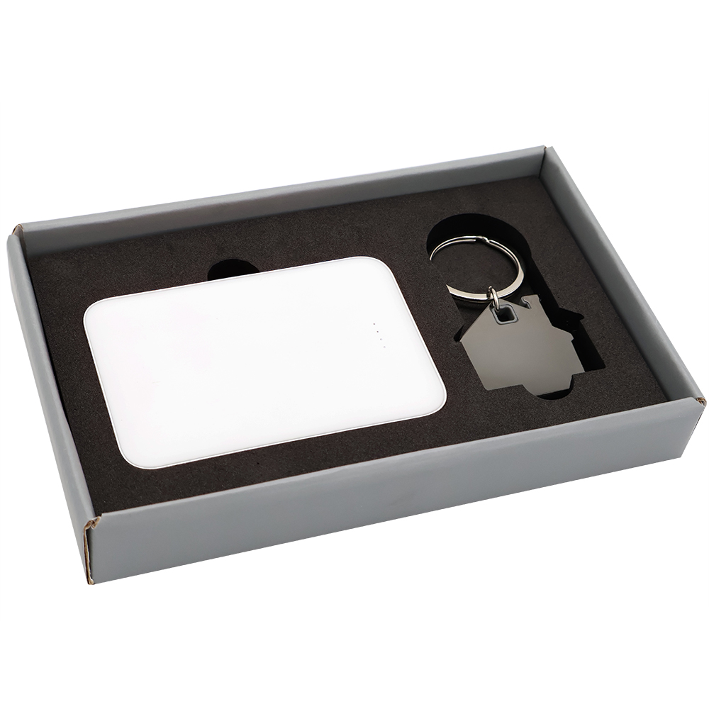 Подарочный набор в элегантной цветной картонной коробке серого цвета с конструкцией крышка-дно. Внутри расположены аккуратно закрепленные на ложементе внешний аккумулятор емкостью 5000 mAh и металлический карманный брелок. Внешний аккумулятор обладает компактным дизайном и обеспечивает надежный запас энергии для мобильных устройств в пути, а стильный металлический брелок станет практичным и эстетичным аксессуаром для ключей. Этот набор идеально подходит в качестве презента для тех, кто ценит удобство, качество и современный стиль. Состав набора: Внешний аккумулятор Fluffy, белый (артикул 2041.01) - 1 шт. Брелок Дом металлический, черный (артикул 12010.02) - 1 шт. Коробка Protect матовой поверхностью, серый (артикул RUS5051.19) - 1 шт.