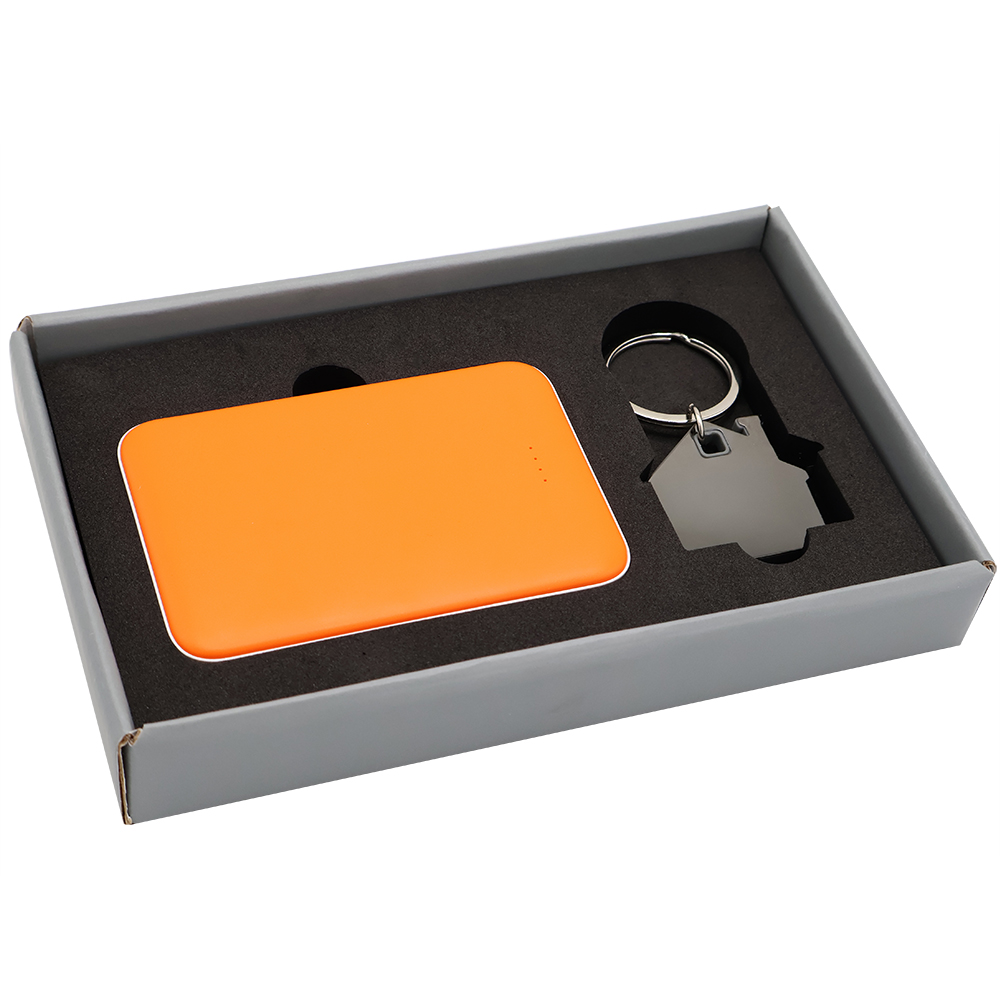 Подарочный набор в элегантной цветной картонной коробке серого цвета с конструкцией крышка-дно. Внутри расположены аккуратно закрепленные на ложементе внешний аккумулятор емкостью 5000 mAh и металлический карманный брелок. Внешний аккумулятор обладает компактным дизайном и обеспечивает надежный запас энергии для мобильных устройств в пути, а стильный металлический брелок станет практичным и эстетичным аксессуаром для ключей. Этот набор идеально подходит в качестве презента для тех, кто ценит удобство, качество и современный стиль. Состав набора: Внешний аккумулятор Fluffy, оранжевый (артикул 2041.07) - 1 шт. Брелок Дом металлический, черный (артикул 12010.02) - 1 шт. Коробка Protect матовой поверхностью, серый (артикул RUS5051.19) - 1 шт.