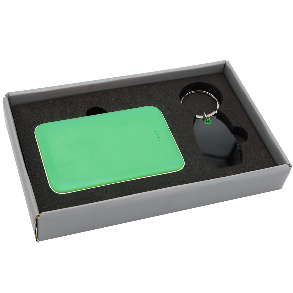 Подарочный набор в элегантной цветной картонной коробке серого цвета с конструкцией крышка-дно. Внутри расположены аккуратно закрепленные на ложементе внешний аккумулятор емкостью 5000 mAh и металлический карманный брелок. Внешний аккумулятор обладает компактным дизайном и обеспечивает надежный запас энергии для мобильных устройств в пути, а стильный металлический брелок станет практичным и эстетичным аксессуаром для ключей. Этот набор идеально подходит в качестве презента для тех, кто ценит удобство, качество и современный стиль. Состав набора: 1. Внешний аккумулятор Fluffy, зеленый (артикул 2041.04) - 1 шт. 2. Брелок Nobel металлический, зеленый (артикул 12011.04) - 1 шт. 3. Коробка Protect матовой поверхностью, серый (артикул RUS5051.19) - 1 шт.