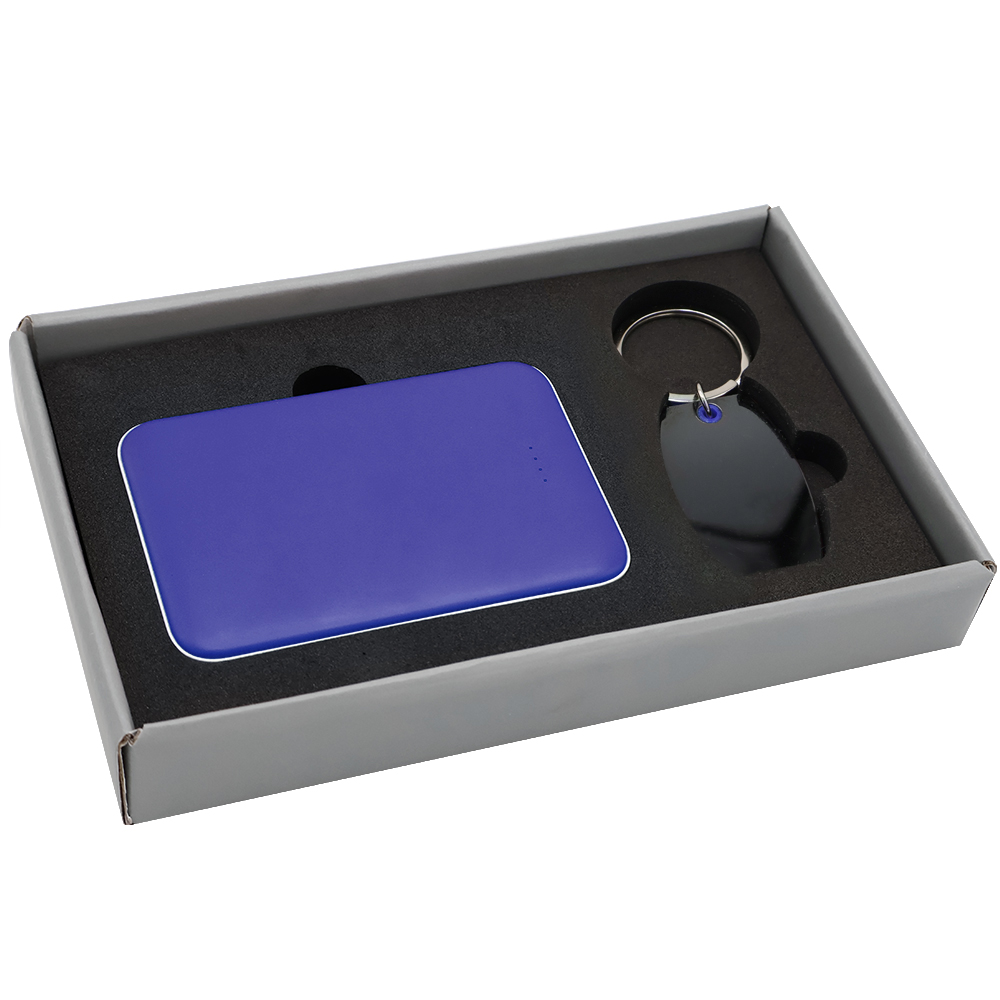 Подарочный набор в элегантной цветной картонной коробке серого цвета с конструкцией крышка-дно. Внутри расположены аккуратно закрепленные на ложементе внешний аккумулятор емкостью 5000 mAh и металлический карманный брелок. Внешний аккумулятор обладает компактным дизайном и обеспечивает надежный запас энергии для мобильных устройств в пути, а стильный металлический брелок станет практичным и эстетичным аксессуаром для ключей. Этот набор идеально подходит в качестве презента для тех, кто ценит удобство, качество и современный стиль. Состав набора: 1. Внешний аккумулятор Fluffy, синий (артикул 2041.15) - 1 шт. 2. Брелок Nobel металлический, синий (артикул 12011.03) - 1 шт. 3. Коробка Protect матовой поверхностью, серый (артикул RUS5051.19) - 1 шт.