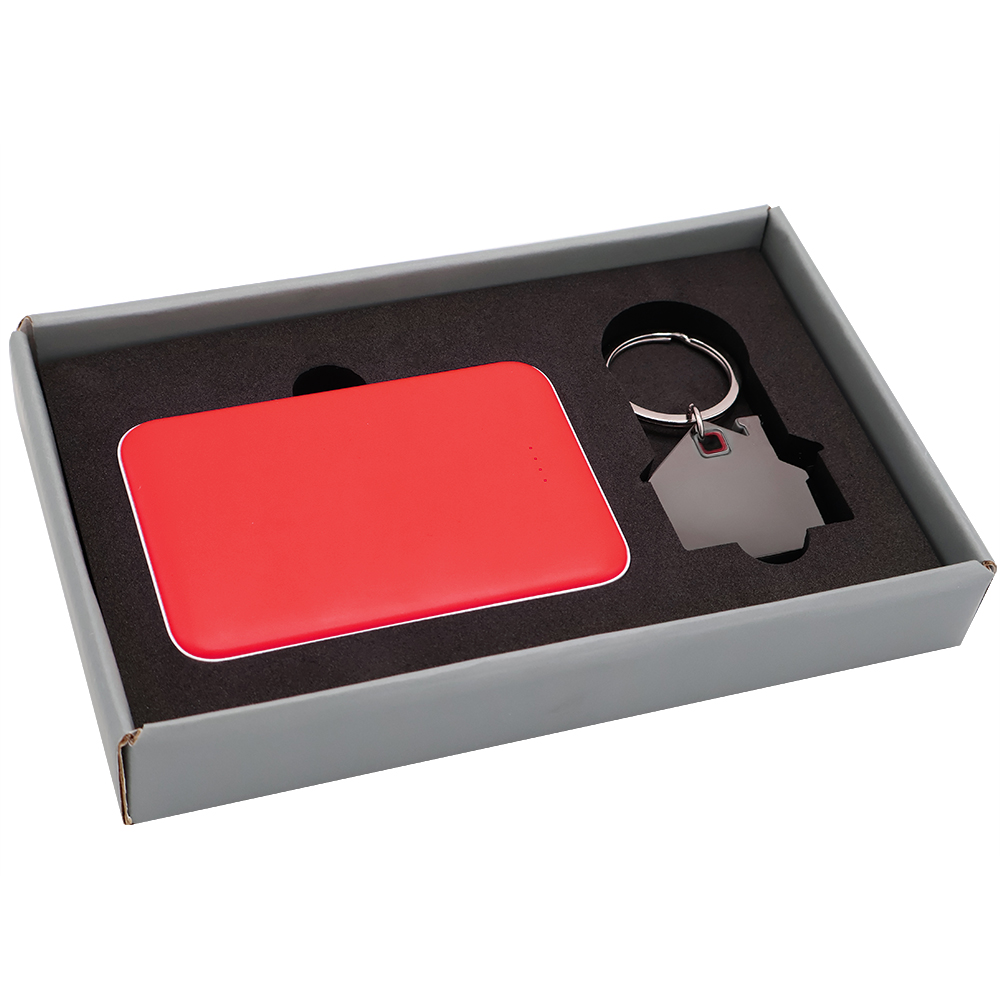 Подарочный набор в элегантной цветной картонной коробке серого цвета с конструкцией крышка-дно. Внутри расположены аккуратно закрепленные на ложементе внешний аккумулятор емкостью 5000 mAh и металлический карманный брелок. Внешний аккумулятор обладает компактным дизайном и обеспечивает надежный запас энергии для мобильных устройств в пути, а стильный металлический брелок станет практичным и эстетичным аксессуаром для ключей. Этот набор идеально подходит в качестве презента для тех, кто ценит удобство, качество и современный стиль. Состав набора: Внешний аккумулятор Fluffy, красный (артикул 2041.05) - 1 шт. Брелок Дом металлический, красный (артикул 12010.05) - 1 шт. Коробка Protect матовой поверхностью, серый (артикул RUS5051.19) - 1 шт.