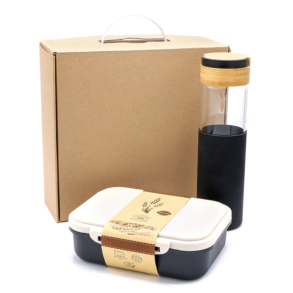 Оригинальный и стильный набор для перекуса в самых неожиданных местах, отличающийся утонченным стилем и совершенством деталей. Вам не придется думать над подарком - просто бери и дари! Упаковка из МГК с пластиковой ручкой, обеспечивает удобство погрузки и разгрузки, сохранность в пути. Коробка двусторонняя, можно сложить как крафтовой, так и белой стороной. Оличное решение для упаковки Вашего МЕРЧА. Возможность нанесения логотипа дополнит Вашу индивидуальность. Механизм открытия / закрытия - чемодан. Состав набора: Бутылка стеклянная с силиконовой манжетой и бамбуковой крышкой Glass , черный - 1 шт. (Артикул: 14032.02) Ланчбокс (контейнер для еды) Ulf, черный - 1 шт. (Артикул 13003.02) Наполнитель - стружка бумажная, бежевый – 1 шт. (артикул: 62000.13) Подарочная коробка из МГК 24,5*25,5*10,5 см - 1 шт. (Артикул: 53305)