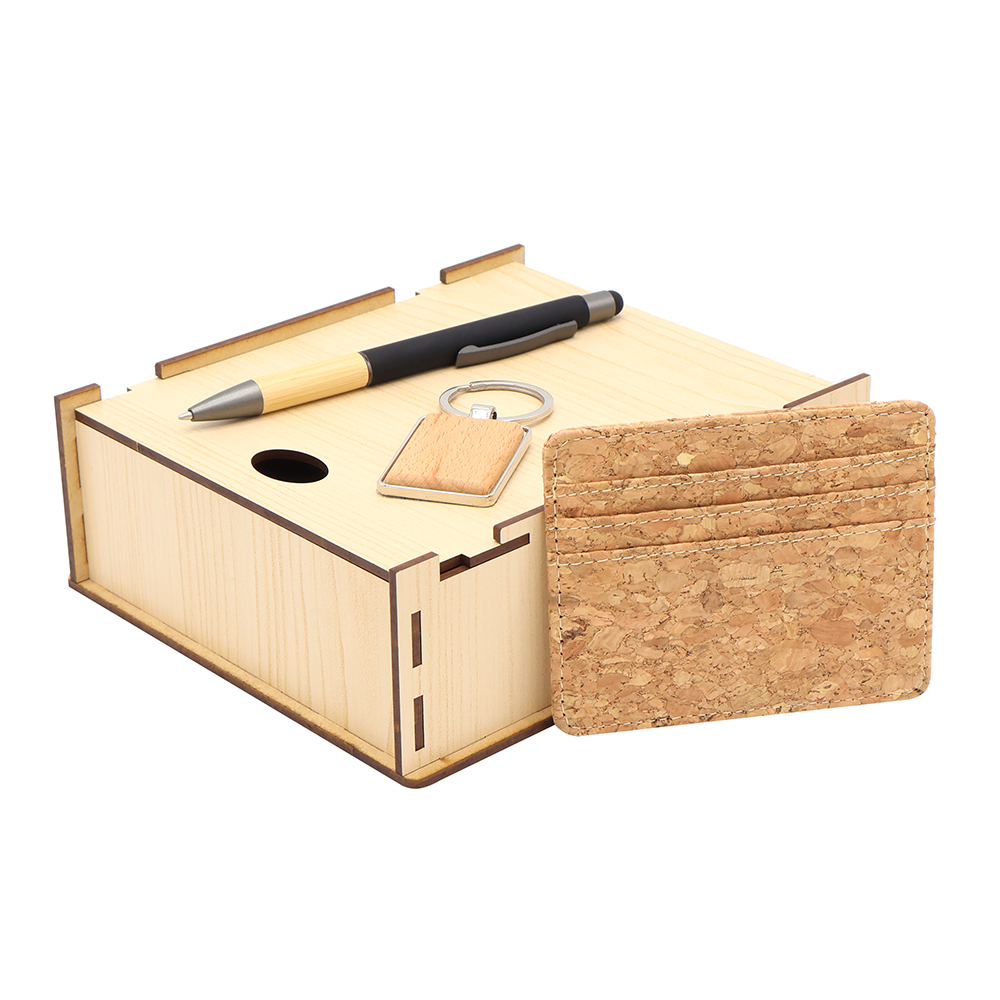 Оригинальный и стильный набор эко, отличающийся утонченным стилем и совершенством деталей. Вам не придется думать над подарком - просто бери и дари! Упаковка из древесноволокнистной плиты высокой плотности (ХДФ/HDF) обеспечивает удобство погрузки и разгрузки, сохранность в пути. Состав набора: Подарочная коробка ламинированная из HDF 17,5*15,5*6,5 см - 1 шт. (Артикул: 53302) Ложемент см (ручка + Держатель банковских карт + Брелок) - 1 шт. (Артикул 53302.3) Держатель банковских карт Set - 1 шт. (Артикул: 37008.00) Брелок Woody S (прямоугольник) - 1 шт. (Артикул: 12023.19) Ручка металлическая Сайрис софт-тач - 1 шт. (Артикул: 1045.02)