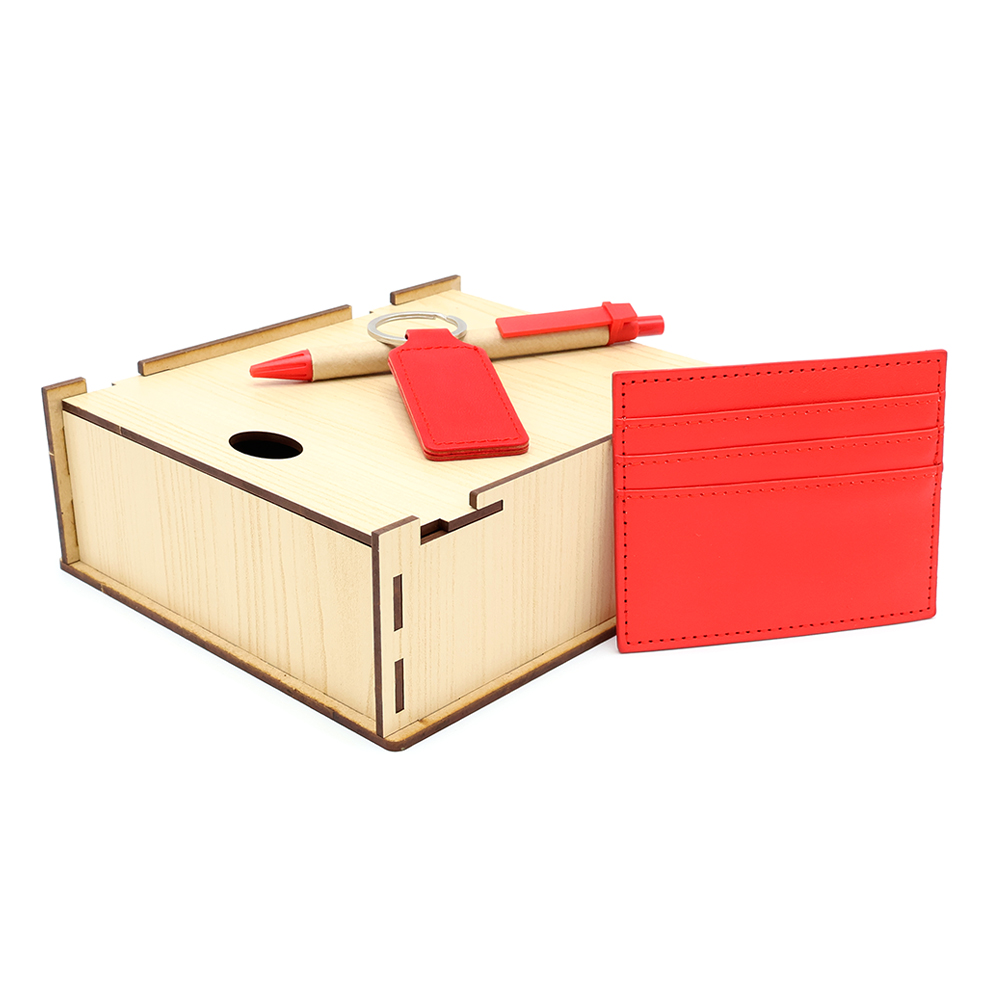Оригинальный и стильный набор, отличающийся утонченным стилем и совершенством деталей. Вам не придется думать над подарком - просто бери и дари! Упаковка из древесноволокнистной плиты высокой плотности (ХДФ/HDF) обеспечивает удобство погрузки и разгрузки, сохранность в пути. Состав набора: Подарочная коробка ламинированная из HDF 17,5*15,5*6,5 см - 1 шт. (Артикул: 53302) Ложемент см (ручка + Держатель банковских карт + Брелок) - 1 шт. (Артикул 53302.4) Держатель банковских карт Versal,красный - 1 шт. (Артикул: 37005.05) Брелок Hors, красный - 1 шт. (Артикул: 12019.05) Шариковая ручка Natural Bio, красный - 1 шт. (Артикул: 1020.05)
