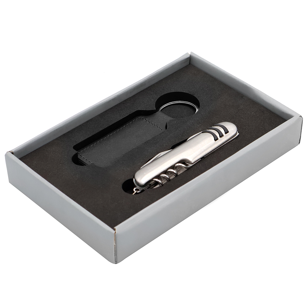 Подарочный набор «Элемент» - функциональность в деталях. • Нож — для дел. • Брелок — для ключей. • Стиль — для вас. Три элемента вашей ежедневной готовности. Упаковано в элегантную коробку — отличный подарок для решения любых задач. Состав набора: 1. Нож многофункциональный Дрезден, серебристый (артикул 39013.09) - 1 шт. 2. Брелок Hors, черный (артикул 12019.06) - 1 шт. 3. Коробка Protect матовой поверхностью, серый (артикул RUS5051.19) - 1 шт.