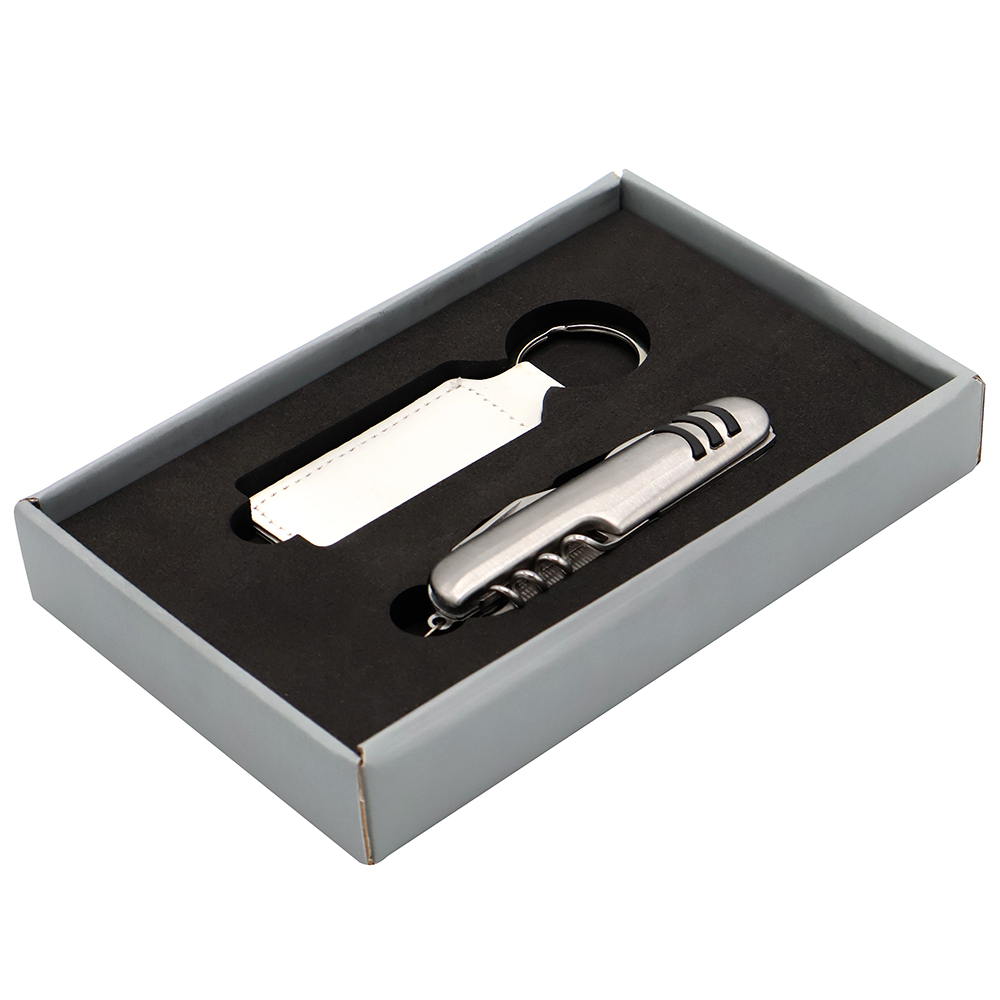 Подарочный набор «Элемент» - функциональность в деталях. • Нож — для дел. • Брелок — для ключей. • Стиль — для вас. Три элемента вашей ежедневной готовности. Упаковано в элегантную коробку — отличный подарок для решения любых задач. Состав набора: 1. Нож многофункциональный Дрезден, серебристый (артикул 39013.09) - 1 шт. 2. Брелок Hors, белый (артикул 12019.01) - 1 шт. 3. Коробка Protect матовой поверхностью, серый (артикул RUS5051.19) - 1 шт.