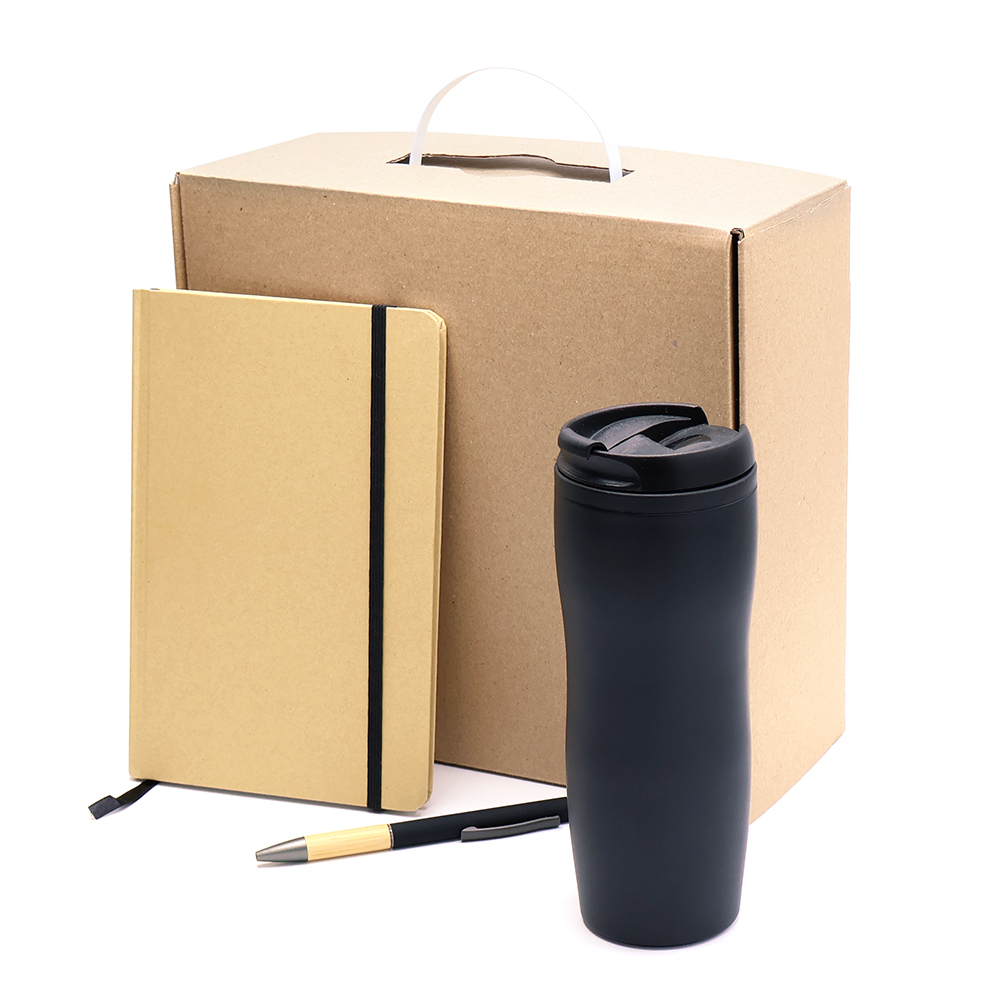 Очень изящный подарочный набор, гармонично сочетающий в себе традиции и современные тенденции! Упаковка из МГК с пластиковой ручкой, обеспечивает удобство погрузки и разгрузки, сохранность в пути. Оличное решение для упаковки Вашего МЕРЧА. Возможность нанесения логотипа дополнит Вашу индивидуальность. Механизм открытия / закрытия - чемодан. Состав набора: Подарочная коробка из МГК 24,5*25,5*10,5 см - 1 шт. Артикул: 53305) Блокнот "Элвин" с линованными страницами, черный - 1 шт. (Артикул: 51004.02) Ручка металлическая Сайрис софт-тач, черный - 1 шт. (Артикул: 1045.02) Термокружка Gamma, матовый, черный - 1 шт. (Артикул: 5028.02) Наполнитель - стружка бумажная, бежевый 100 гр. - 1 шт (Артикул: 62000.13)