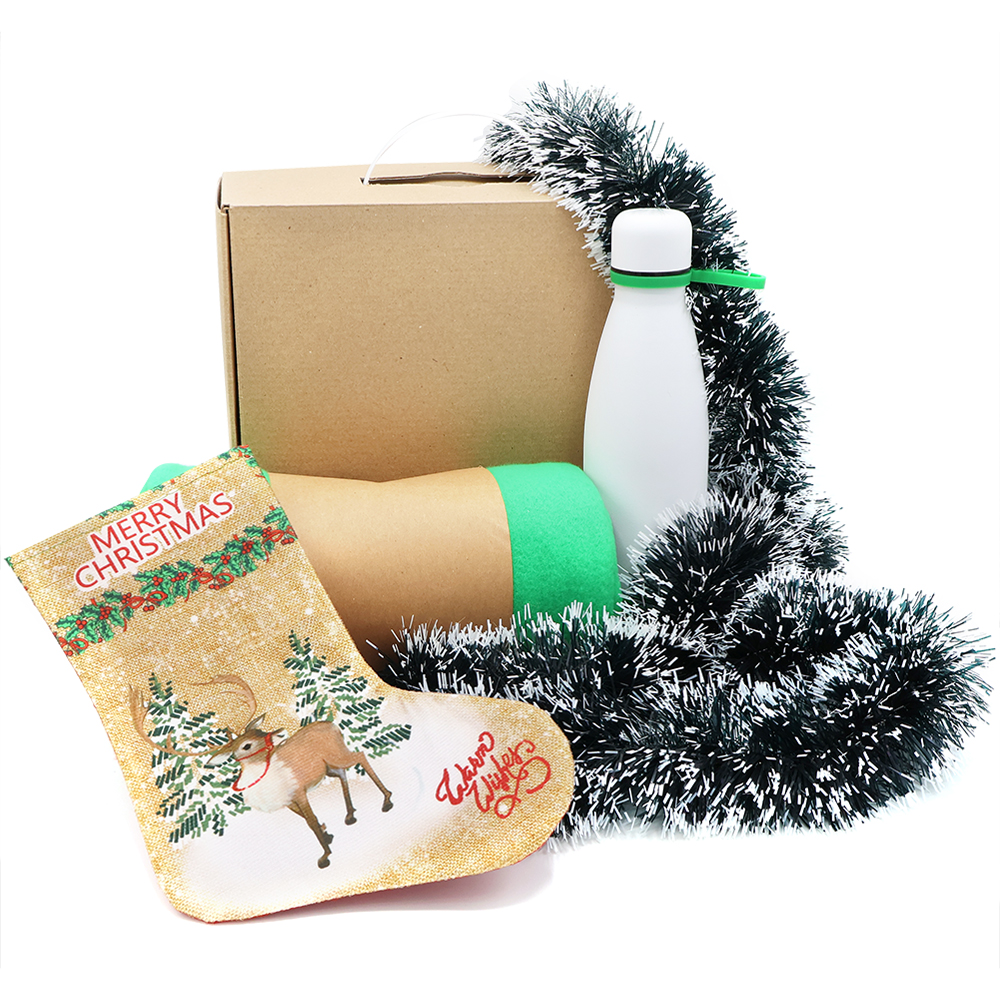 Этот подарочный набор подарит тепло и уют в холодное время года, создавая атмосферу праздника и комфорта. Идеальное сочетание практичности и праздничного настроения. Состав набора: Подарочная коробка из МГК (с ручкой) - артикул 53305 Плед PATIO, зеленый - артикул 16008.24 Вакуумная термобутылка Olivia, белый - артикул 5050.01, кольцо-держатель зеленый; манжета - зеленый Новогодняя мишура - зелено-белый - артикул SYMTA-162079 Сапожок подарочный новогодний №5 — олень бежевый - артикул SYWZ-082008