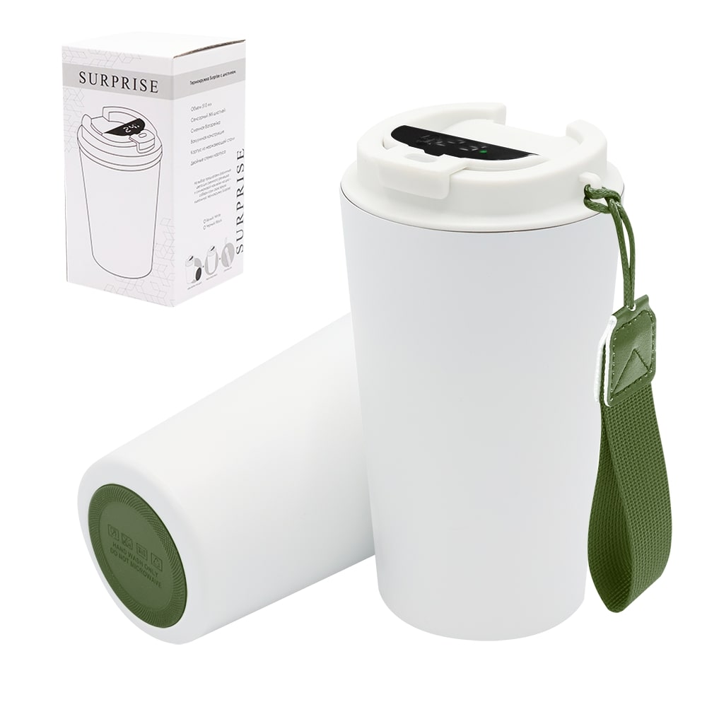 Термокружка Surprise To Go с дисплеем выполнена из пищевой нержавеющей стали. Имеет двойные стенки с вакуумной изоляцией, а крышка изготовлена из пищевого безопасного для человека пластика. Термокружка Surprise To Go не только сохраняет ваши напитки горячими, но и показывает температуру напитка! Уникальная особенность данной термокружки – наличие сенсорного индикатора температуры, расположенного в крышке. Чтобы узнать температуру напитка внутри кружки, достаточно прикоснуться к поверхности крышки. Работает от 1 батарейки типа CR2032 (в комплекте), которую в последующем можно самостоятельно заменить. - качественные и безопасные материалы - двойные стенки из нержавеющей стали - сенсорный ЖК-дисплей - информация о температуре жидкости - батарею можно заменить самостоятельно -отличные теплоизоляционные свойства - эргономичный дизайн - удобная форма В комплект уже входит силиконовая накладка и шнурок. Насладись своим кофе в компании термокружки Surprise To Go!