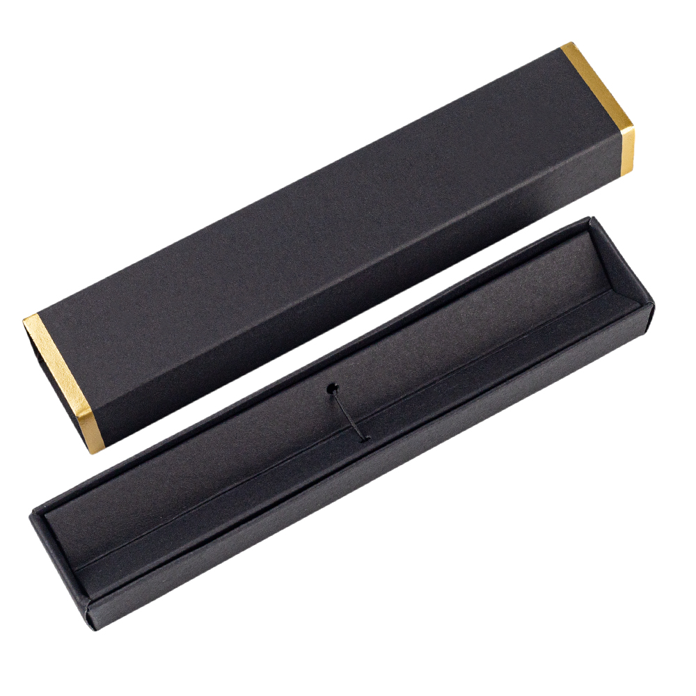 Бумажная коробочка для ручки. Ложемент V-образный с резинкой, фиксирующей ручку. По краям крышки металлизированные декоративные элементы, для красоты. В такой коробочке подаренная ручка будет выглядеть ещё дороже, словно фотомодель в вечернем платье.