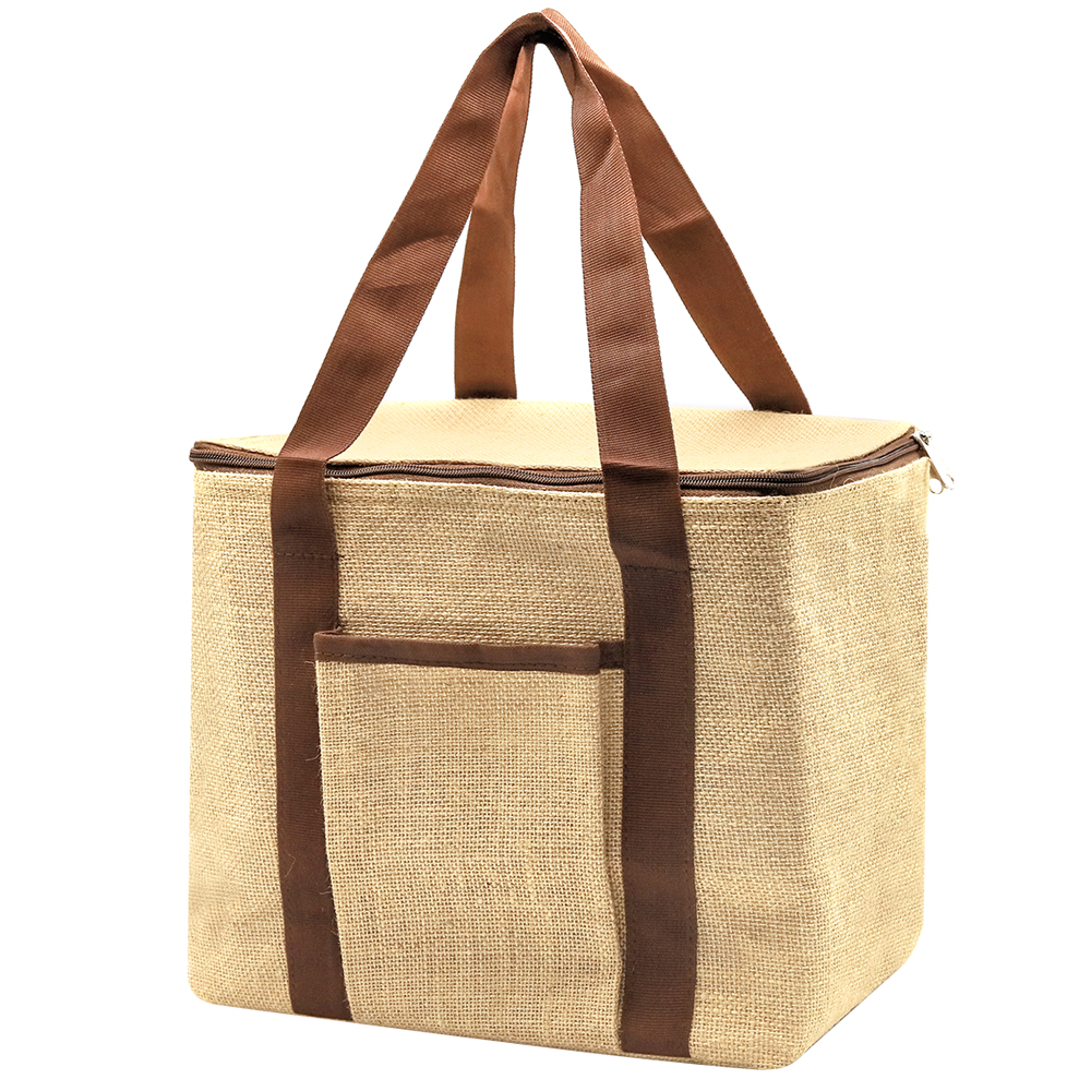 Удобная и вместительная сумка-холодильник из джута позволит взять все необходимые продукты для пикника и сохранит их свежими. Внутренняя часть имеет отделку из алюминиевой фольги, которая защищает содержимое от высоких температур. Закрывается на молнию, что еще больше улучшает изотермические характеристики. Сумка закрывается на молнию и имеет две удобные хлопковые ручки для ношения на плече или в руке. Спереди есть небольшой хлопковый карман для мелких вещей. примерный объем в литрах - 12