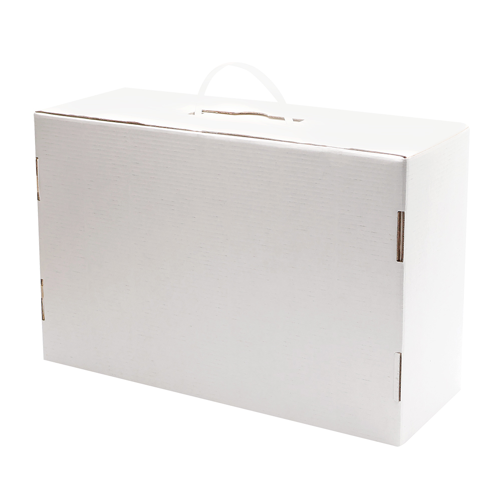 Упаковка из МГК с пластиковой ручкой, обеспечивает удобство погрузки и разгрузки, сохранность в пути. Отличное решение для упаковки Вашего МЕРЧА. Возможность нанесения логотипа дополнит Вашу индивидуальность. Механизм открытия / закрытия - чемодан Коробка двухсторонняя. Может быть белая снаружи крафтовая внутри или наоборот, крафтовая снаружи белая внутри. По умолчанию собирается белой стороной