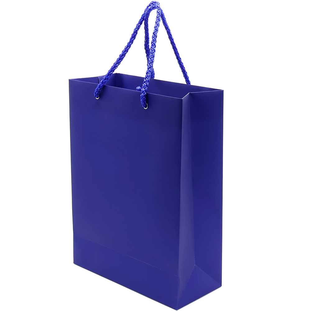 Бумажный пакет плотностью 170 г/м². Покрытие софт-тач. Шнур 6 мм синего цвета. Люверс - серебристый.