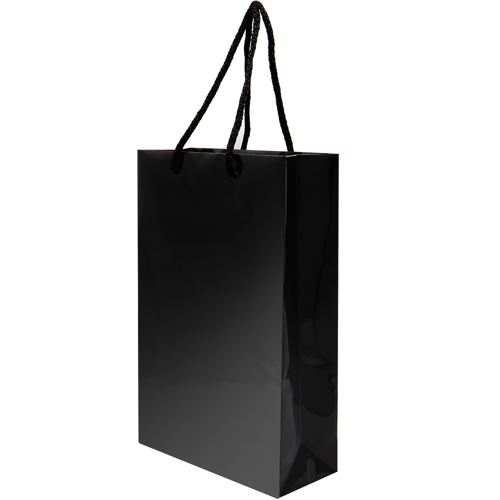 Бумажный пакет плотностью 170 г/м² с глянцевой ламинацией. Шнур 6 мм черного цвета. Люверс - черный.