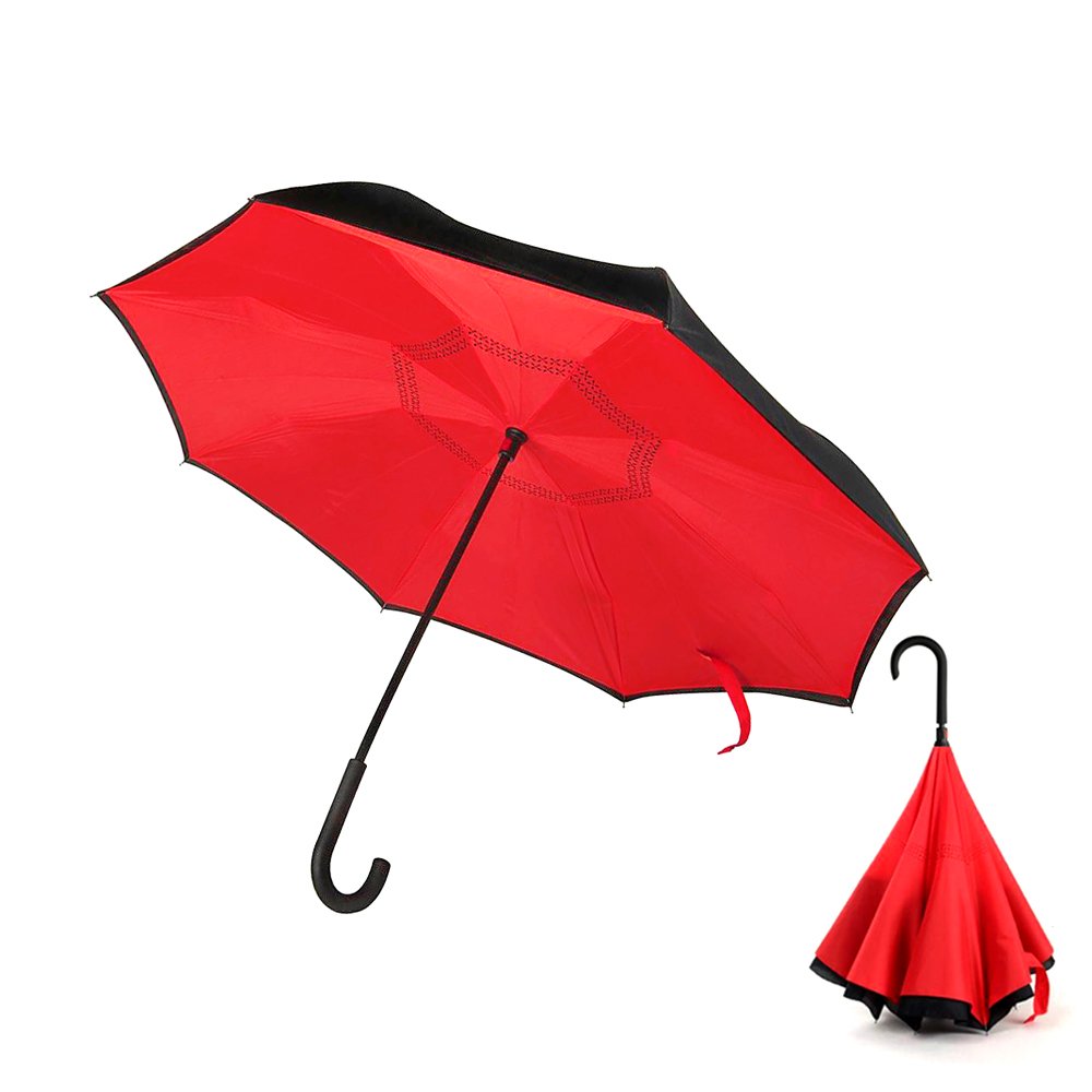 Зонт-трость механический обратного сложения Chaplin выполнен из двухслойной двухцветной ткани эпонж. Спицы - стеклопластик. Металлический каркас. Механический тип: ручное открытие и ручное закрытие. Ручка: черная ручка J с софтач покрытием. Диаметр купола -105 см. Длина - 79 см. Чехол.